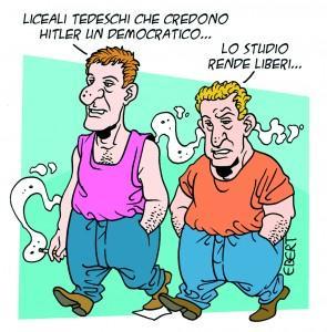 Secondo un recente studio un liceale tedesco su tre pensa che Hitler fosse un difensore dei diritti umani. Gli altri due votano Merkel. Non sono razzisti è che da bravi adolescenti ignorano tutto ciò che precede l’IPhone. Letteralmente non sanno chi è Hitler. Che fare? Possiamo abbandonarli e ottenere mano d’opera stolta (nella pedagogia moderna si chiama Ipotesi Gelmini) oppure istruirli. Misurandoci alle capacità dei giovani racconteremo la storia dell’uomo in 160 caratteri a botta. Ecco i dati minimi per non essere infame, xenofobo, stronzo, oh giovane. Nella sociologia moderna si chiama nonvotarePdl, per piacere.
