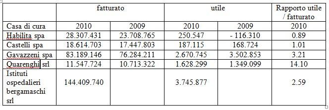 Nella provincia di Bergamo, ad esempio, come riportato dall’edizione 2011 dell’allegato dell’Eco di Bergamo “Bergamo 1000 aziende report annuale imprese leader della provincia di Bergamo”, tutte le aziende sanitarie hanno avuto degli utili più o meno buoni ma come mai se comunque gli utili sono così “limitati” tutti investono tanto in sanità? Come mai la Quarenghi appare fra le prime ad utili? Forse perché è una struttura a carattere familiare e non fa parte di un grosso gruppo? Tipico è il caso San Raffaele che è stato acquistato, senza praticamente gara, accollandosi un elevato debito.