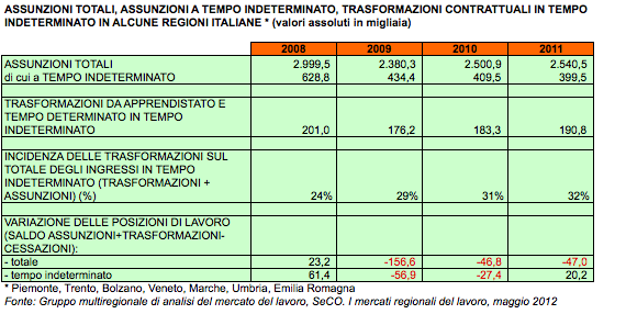 Con grande enfasi televisioni e giornali hanno commentato le previsioni di Unioncamere-Excelsior per il terzo trimestre 2012. In particolare, i media si sono soffermati sul dato secondo cui su 158.840 assunzioni previste, quelle a tempo indeterminato sarebbero il 19,8 per cento (35,7 per cento al netto delle assunzioni stagionali). (1) Se ne ricava che “il posto fisso è sempre più un miraggio” (Repubblica), “il posto fisso? resta il sogno proibito per l’80 per cento dei nuovi assunti” (Corriere della sera) e così via commentando.