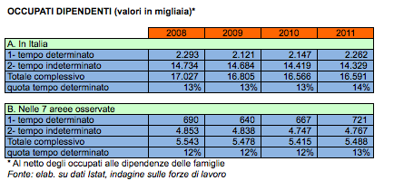 Un trend analogo lo ritroviamo anche nei dati Istat che per il 2009 e il 2010 segnalano, rispetto al 2008, la riduzione della quota di occupati a tempo determinato. Sembra diverso il trend del 2011: secondo Istat gli occupati a termine sono in aumento e quelli a tempo indeterminato sono in calo, mentre nei dati amministrativi il risultato è invertito. La spiegazione è semplice: i dati Istat, essendo medie annuali, risentono degli accenni di ripresa nella prima parte dell’anno poi naufragati nel secondo semestre, mentre i dati amministrativi, essendo rilevati sulla situazione di fine anno, registrano efficacemente l’ulteriore irrigidimento delle posizioni a tempo indeterminato dovuto ai cambiamenti delle regole di accesso al pensionamento.In sostanza, l’economia e la società italiana hanno già gravi e nuovi problemi – in primis la crisi della domanda e quindi dell’occupazione. Non serve leggere ulteriori peggioramenti anche dove, magari paradossalmente, (ancora) non ci sono.