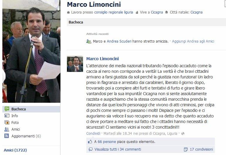 “La realtà dei fatti è che un delinquente di professione ladro visitava le nostre case e negozi. Qualcuno doveva fermarlo”. Il commento è quello dell’ex sindaco leghista di Cicagna (in provincia di Genova) Marco Limoncini, ora capogruppo dell’Udc in consiglio comunale e consigliere regionale dopo il pestaggio che ha ridotto in fin di vita uno straniero, perpetrato da tre italiani residenti in paese. L’esponente del partito cristiano democratico ha aperto una discussione sulla sua pagina di facebook, inizialmente dai toni, in parte, pacati. “L’attenzione dei media nazionali tributando l’episodio accaduto come la caccia al nero non corrisponde a verità! La verità è che bravi cittadini arrivano a farsi giustizia da soli perché la giustizia non funziona!”. Il consigliere, dopo aver aggiunto che “Cicagna non si sente assolutamente razzista” e aver augurato un “veloce recupero” all’uomo pestato, ha puntualizzato che “va detto che quanto accaduto ci deve portare a meditare sul fatto che i cittadini hanno necessità di sicurezza”. Infine la vicinanza ai tre “concittadini”.