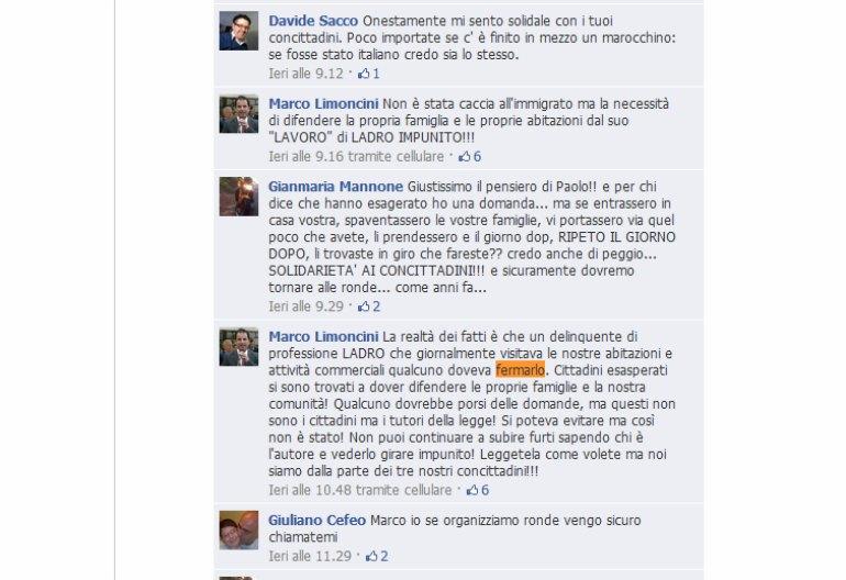 La conseguenza è che nei commenti riemerge l’anima da elettorato leghista. In una trentina di risposte al post nessuno ha deplorato l’aggressione, anzi in molti hanno proposto di organizzare ronde di cittadini in paese. Uno degli amici del consigliere ha spiegato che “forse hanno esagerato e non si sono limitati a dargli una lezioncina”, ma l’ex primo cittadino non ha nessuna pietà: “La realtà dei fatti è che un delinquente di professione LADRO che giornalmente visitava le nostre abitazioni e attività commerciali qualcuno doveva fermarlo. Cittadini esasperati si sono trovati a dover difendere le proprie famiglie e la nostra comunità!”. Infine, Limoncini, se in apertura si è limitato a essere “vicino” agli autori del pestaggio, ha concluso dicendosi dalla loro parte.