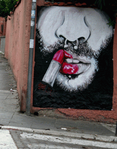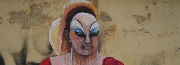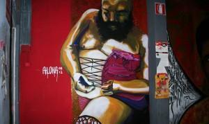 La sua opera più bella, a mio avviso, è quel viso barbuto e machissimo che fa bella mostra di sé al Pigneto, a Roma, intento a passarsi il rossetto sulle labbra, la quintessenza di quel gioco di identità sessuale che la fa da padrone in molti dei suoi “manifesti”. E poi un uomo corpulento che a fatica tenta di allacciarsi un bustier, un altro bear in tutù, una drag queen armata di pistola, un cupo e angosciante monatto, due chiappe marmoree con zainetto sulle spalle. È evidente il gusto che Aloha prova nel riprodurre tipi umani che alla maggioranza di noi strapperebbero un sorriso, se non peggio, così come è chiaro il gusto della provocazione (il profilo di un prorompente pene maschile sotto uno slip griffato è in giro per Roma, tanto per gradire). Quando gli chiedo se “quelli che se ne intendono” si sono accorti di lui, la sua risposta è eloquente: “Ho curatori che mi chiamano regolarmente per sapere novità, galleristi, altri amici artisti, qualche collezionista. Ma per me quelli che se ne intendono sono un po’ dappertutto, non sono solo quelli che lavorano nell’arte. E poi a me piace la reazione delle persone comuni, la loro faccia di fronte a una mia opera. Mi piace stupirli”.