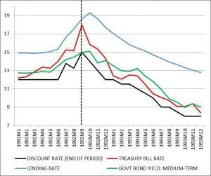 La Figura (fonte: International Financial Statistics del Fmi) mostra chiaramente come andarono le cose. I tassi di interesse cominciarono ad innalzarsi dalla primavera (nel frattempo il governo Amato in fretta e furia provvedeva a smantellare gli ultimi residui di indicizzazione salariale, al solito grido di “l’Europa chiamò”). I tassi di politica monetaria, quello ufficiale di sconto (in nero) e quello sui Bot (in rosso) raggiunsero un picco a settembre (linea tratteggiata verticale), per poi scendere.