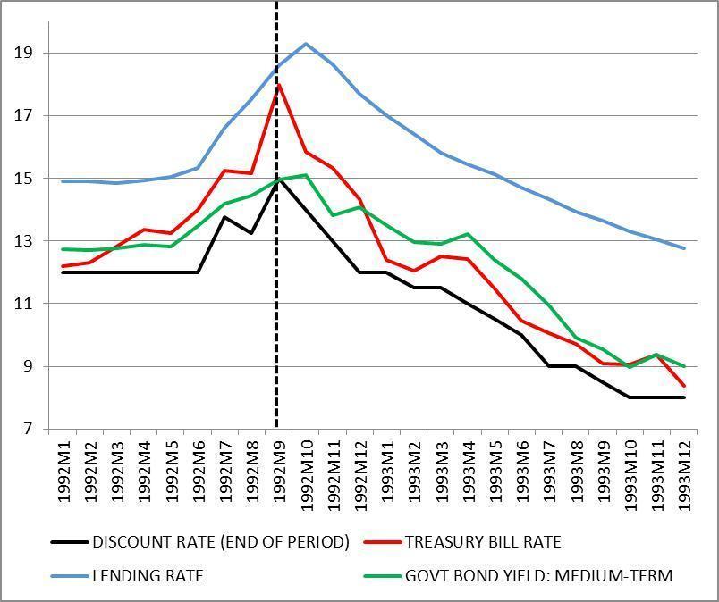 Ora, amici cari, visto che l’innalzamento dei tassi di interesse serviva a difendere il cambio, secondo voi, quando il cambio si mise a fluttuare, i tassi di interesse cosa fecero? Scesero, ovviamente, dato che non era più necessario spingerli oltre il 18% (come nel periodo più acuto della crisi) per invogliare gli investitori ad acquistare titoli in lire, sostenendo il cambio.