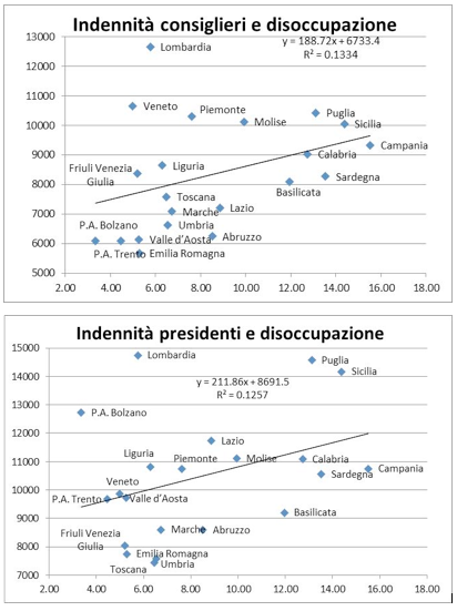 Se si confronta il livello delle indennità regionali al tasso di disoccupazione, la relazione è ancora più forte: le Regioni con il tasso di disoccupazione più alto sono anche quelle con l’indennità maggiore. Risultati simili si possono trovare guardando al tasso di occupazione.