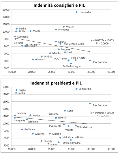 A distanza di un anno, quindi, l’analisi non cambia: tra le Regioni italiane non sussiste quella relazione positiva tra benessere economico dei cittadini (misurato attraverso il Pil pro capite) e lo stipendio dei parlamentari che è presente tra i diversi paesi europei. Al contrario, si trova una relazione negativa tra le indennità di presidenti e Pil pro capite 2009 (ultimi dati disponibili a livello regionale).