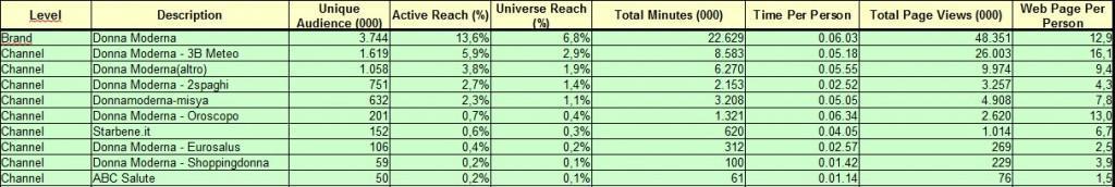 Osservando i dati forniti da Audiweb relativi ad agosto 2012, è possibile capire il “peso” che ha ciascuno dei channel in cui si scompone il traffico di 3.744.000 utenti unici del brand Donna Moderna: 3BMeteo.com 1.619.000 u.u., Oroscopo.it 201.000 u.u., 2spaghi.it 751.000 u.u., Eurosalus.com 106.000 u.u. e Misya.info 632.000 u.u.