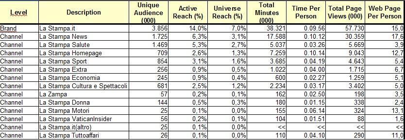 Ma in realtà, approfondendo la ricerca a livello di dominio, i dati di Nielsen NetView (agosto 2012 – utenti unici duplicati) dimostrano la presenza dei domini www.medicitalia.it (34%), www.film.it (8,5%), it.docsity.com (2%) e www.turismo.it (1,9%) che vanno a confluire nei vari canali come ad esempio quello Salute, il secondo channel per volumi di traffico grazie al servizio fornito da Medici Italia. Sono gli stessi editori a decidere se fare comparire o meno un sito partner fra i channel. Il lettore non avvezzo a questi “tecnicismi“, osservando lo schema sopra, non può sapere quello che viene effettivamente conteggiato all’interno del “cappello” del brand “La Stampa”. Analogamente, una classifica come quella del Sole24Ore in cui La Stampa è il quarto quotidiano generalista per utenti unici risulta “falsata”. E’ evidente infatti che quando si leggono le classifiche sulle testate più lette non ci si stia in realtà riferendo alla testata che in quanto tale produce notizie, ma al brand che al suo interno può contenere siti e servizi eterogenei fra loro.