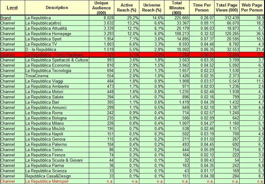 Sono molte le testate che hanno adottato questo “stratagemma”, lo ripetiamo, totalmente lecito. Un altro esempio può essere Repubblica e la sua partnership con la versione italiana di Tom’s Hardware che frutta 1.121.000 di utenti unici sugli 8.028.000 del brand Repubblica ed è il settimo channel per volume di traffico, più di Spettacoli&Cultura, Economia e altri (di seguito il grafico con il dettaglio).