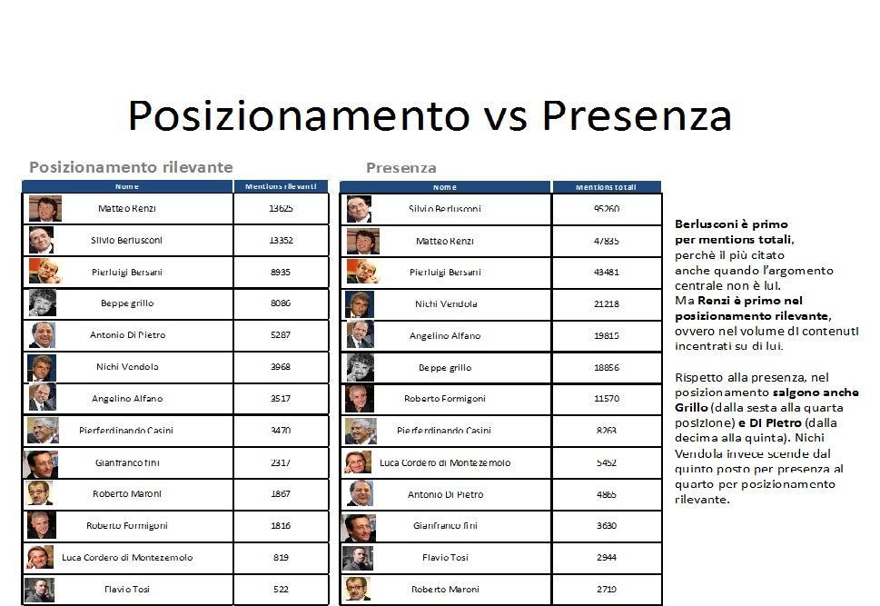 Il metodo utilizzato punta a superare lo scoglio della manipolazione dei numeri, marcando piuttosto la differenza tra presenza in rete e posizionamento rilevante. “Le pagine ufficiali – spiega Andrea Barchiesi, ad della società – sono ambienti addomesticati, gestiti direttamente o tramite società specializzate che riescono con una certa facilità a manipolare i numeri. Più complicato è influenzare i valori fondamentali degli spazi non ufficiali, gruppi, forum, blog, conversazioni dove il meccanismo è quello dei cerchi concentrici: un politico posta qualcosa e questo ha effetto su anelli sempre più larghi e periferici della rete dove questo tipo di analisi assume un valore statistico e analitico rilevante”. Prima del focus sulle primarie nel centrosinistra un avviso al navigante di centro-destra: Silvio Berlusconi minaccia di tornare in campo, ma un milione di italiani gli stanno notificando con tutti i mezzi (post, blog, gruppi etc) la propria avversione. Il de profundis per l’ex premier rimbomba sotto il peso di pagine e gruppi negativi venti volte più numerosi dei positivi. La rete, insomma, ha deciso: il suo ventennio è finito.