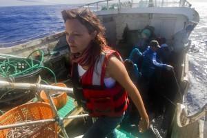 Quando incontriamo un peschereccio la prassi è sempre la stessa. Il segnale sul radar, lta chiamata al capitano, la richiesta di poter salire a bordo, e via sul gommone! Intercettiamo il primo peschereccio il 2 ottobre. È spagnolo. Salgo a bordo e, di fronte a me, ecco la cattura giornaliera in tutta la sua gravità: tonni pinna gialla, un tonno obeso, un marlin, due enormi pesci spada, e… uno squalo. Quando si pesca con palamiti, le catture accessorie sono inevitabili. Come la meravigliosa manta oceanica – sulla lista degli animali in pericolo – che vedo saltare a pelo d’acqua a poca distanza da noi. I pescatori catturano anche lei e poi la liberano. Ci dicono di farlo normalmente, ma senza nessuno che controlli risulta difficile crederlo.