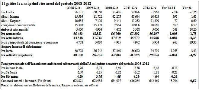 Ebbene, se si confronta l’andamento dell’Iva netta per il settore Sir nei primi otto mesi del 2012 con quello dei primi otto mesi del 2011, si nota che la riduzione percentuale dell’Iva netta è stata del -4,97 per cento, una percentuale di alcune volte superiore al calo dei consumi interni e dei consumi intermedi della Pa pari a -0,59 per cento, secondo i dati Istat (vedi ultima riga della tabella).