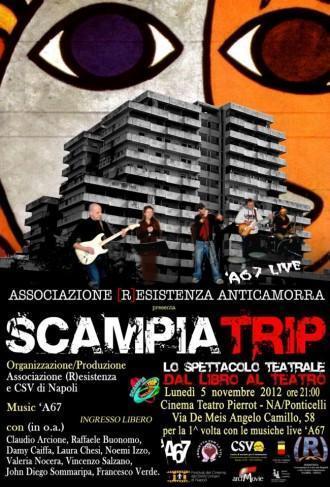 Si parte il 5 Novembre alle ore: 21 dal Cinema Pierrot (Ponticelli – Na) con lo spettacolo “Scampia Trip”, che inaugura il “Festival del Cinema dei Diritti Umani” di Napoli. Uno spettacolo prodotto dall’associazione (R)esistenza e dal C.S.V. di Napoli e messo in scena dai ragazzi del quartiere. “Scampia Trip” è la trasposizione teatrale dell’omonimo progetto multimediale uscito nel 2010 per Ad est dell’equatore.