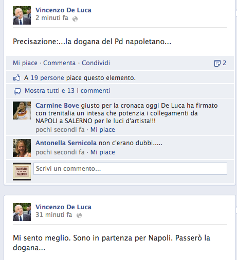 Quindi non si è fermato. Fino a soffiare sul fuoco di un campanilismo ai limiti del becero. Un’ora fa sulla sua pagina ufficiale di facebook, in procinto di andare nel capoluogo di regione per un’iniziativa politica di Bersani, ha scritto: “Mi sento meglio. Sono in partenza per Napoli. Passerò la dogana…”. Apriti cielo. Quasi 200 commenti tra salernitani entusiasti di definire i napoletani ‘puzzolenti’, che suggeriscono a De Luca di vaccinarsi per evitare infezioni, e napoletani offesi come Lucia che scrive: “No da napoletana che la stimava come sindaco e uomo politico mai mi sarei aspettata un’affermazione del genere…”.