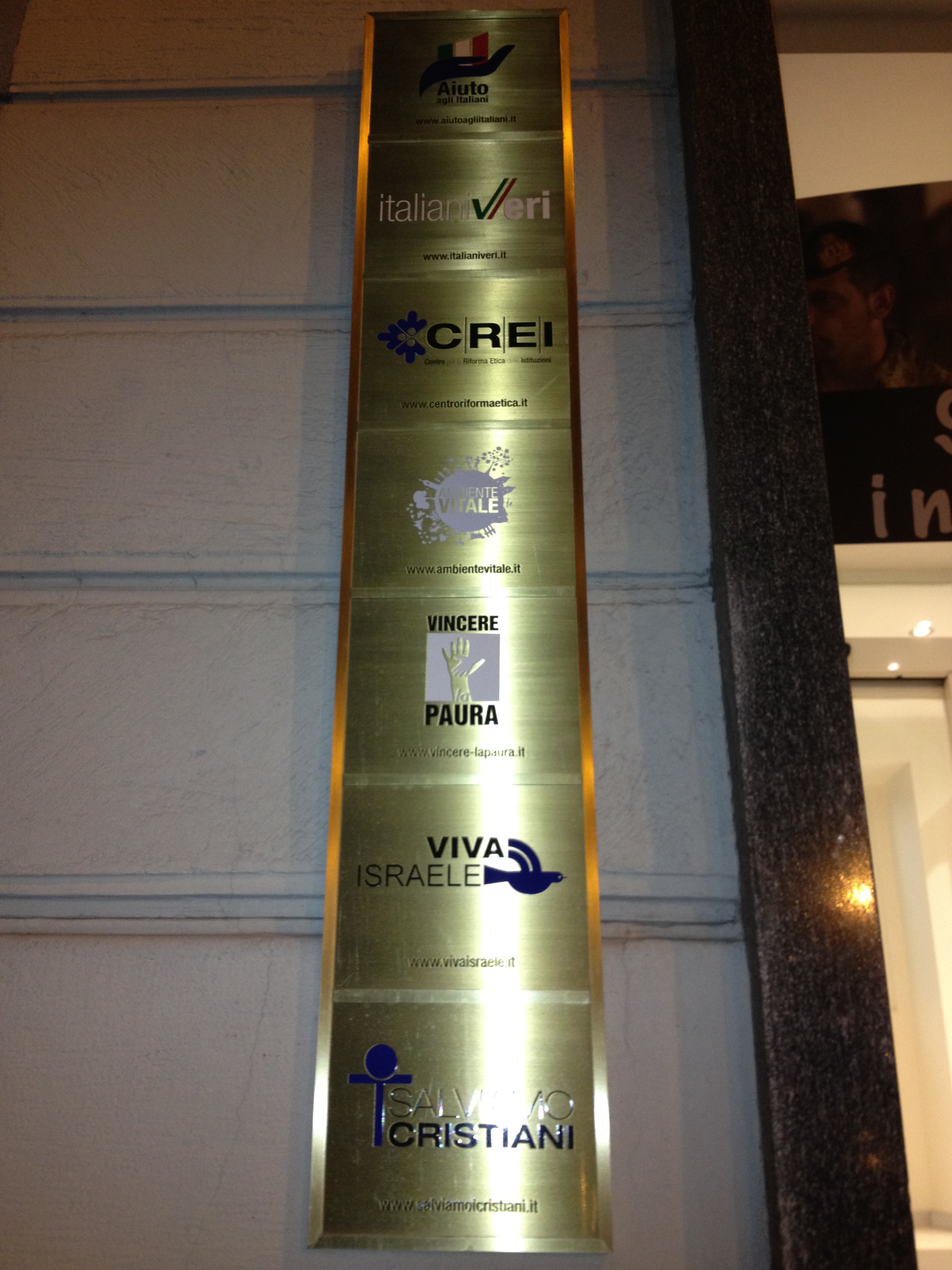 Sette targhette all’ingresso della sede milanese di “Io amo l’Italia” di Magdi Allam che promuovono associazioni a lui legate a favore di Israele, identità nazionale e cristianità. Siti che, a quasi un anno di distanza, continuano a non funzionare o, peggio ancora, non sono riconducibili in nessun modo all’eurodeputato (qui la lista). Sembrava che Internet giocasse un ruolo fondamentale per la campagna elettorale: ma i portali ideati ad hoc, nella migliore delle ipotesi, sono contenitori vuoti.