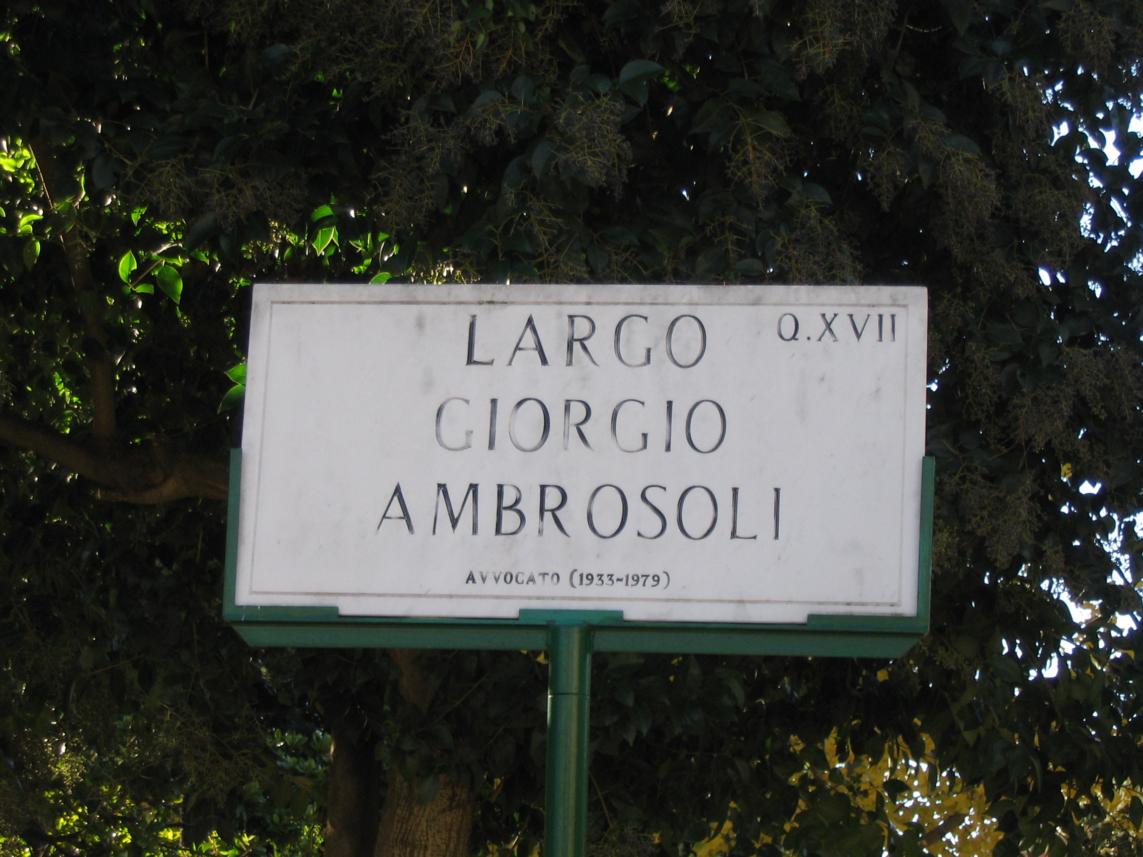Sapevo da tempo, l’intitolazione era infatti avvenuta durante le precedenti amministrazioni, della dedica di una piazza all’interno della villa Paganini, piccolo e bel parco pubblico sulla via Nomentana a Roma a Giorgio Ambrosoli, l’eroe borghese che non si era piegato ai poteri collusi con la malavita internazionale. Solo due giorni fa ho potuto vedere che i viali del giardino sono dedicati a illustri uomini che hanno combattuto anche a prezzo della loro vita la malavita organizzata.