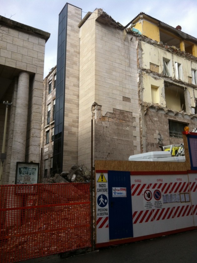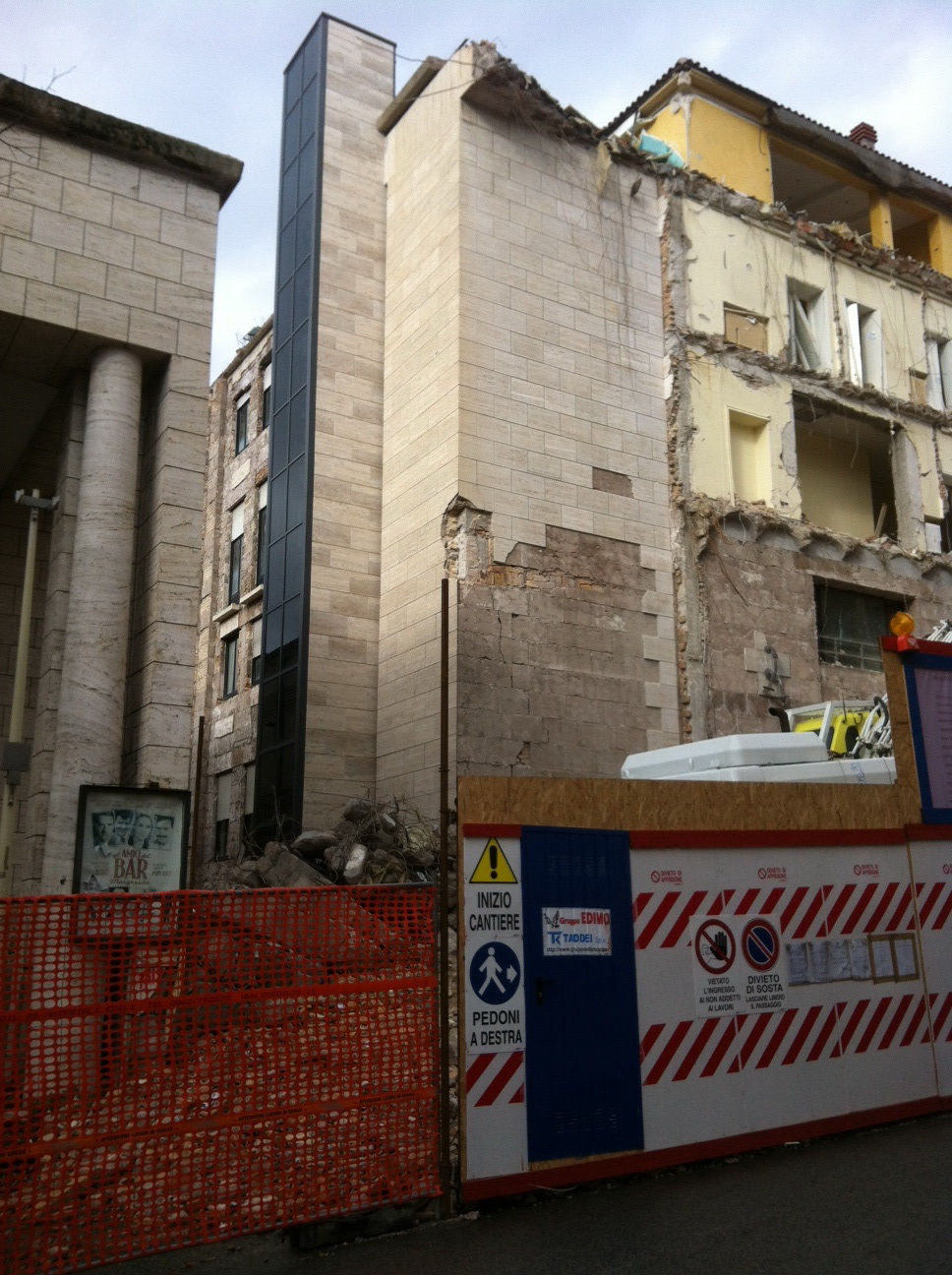 Il cartello di cantiere della demolizione avvenuta una settimana fa all’Aquila parla, con terrificante cinismo, di ‘sostituzione edilizia’: è il business della trasformazione del cadavere dell’Aquila in un redditizio zombie ad alto rendimento, prima edilizio e poi forse turistico. E se questo è l’obiettivo, cosa c’è di meglio che decimare i pochi, e già stanchi guardiani della memoria e dell’identità di quella che era, e forse non sarà mai più, una città?