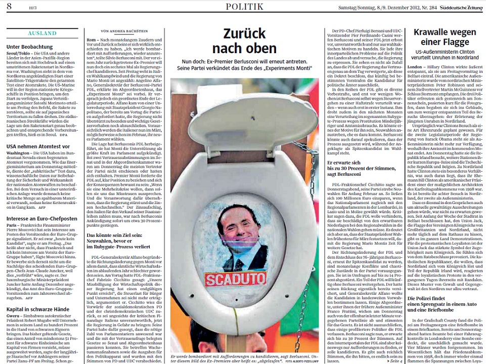 Pagina 8 della Süddeutsche Zeitung, sabato 8 dicembre. Nel giorno in cui Mario Monti salirà al Colle da Napolitano per annunciare le dimissioni dopo l’approvazione della legge di stabilità, il giornale tedesco commenta la scelta di Silvio Berlusconi di scendere in campo, ancora una volta.