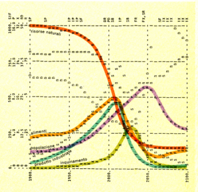 Lo studio non pretendeva di fare delle previsioni precise ma è impressionante vedere come la crisi in cui ci troviamo oggi corrisponde bene all’inizio del declino previsto dal “caso base” dello studio, ovvero quello basato sui dati che all’epoca erano ritenuti i più affidabili. Questo lo vedete nella figura, presa dalla copertina dell’edizione italiana del 1972. Notate come le curve per la produzione industriale e agricola cominciano a declinare a partire dal secondo decennio del secolo attuale.