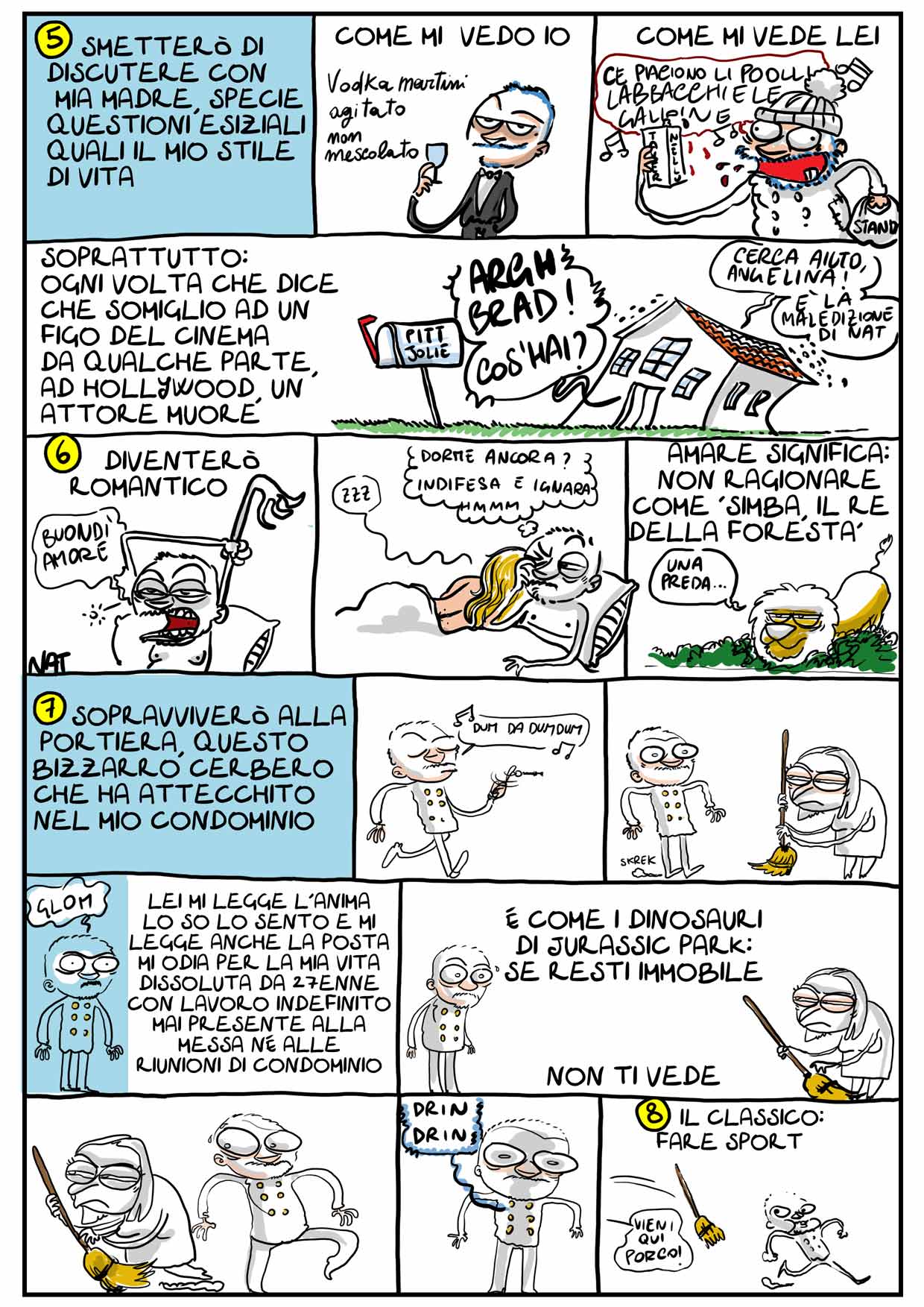 Con l’arrivo dell’anno nuovo, io come milioni di italiani che copiano le cose dai film americani (e finiamo col fare robe tipo ‘halloween’), io – dicevo – sono già al lavoro sulla mia nuova ‘lista di buoni propositi 2013′, così da poterla ignorare il prima possibile. E’ una lista drammaticamente uguale ogni anno, ma aggiornata a seconda dei disastri occorsi nei dodici mesi superati per miracolo. Per chi si fosse messo in contatto solo ora, segnalo che da oggi e fino al 6 Gennaio troverete in edicola, allegato a Il Fatto Quotidiano e a soli 2,80 euro, il libro ‘2012 con loden’: vignette strisce e fumetti editi e inediti, full color, insieme a Vauro. Qui altre info.