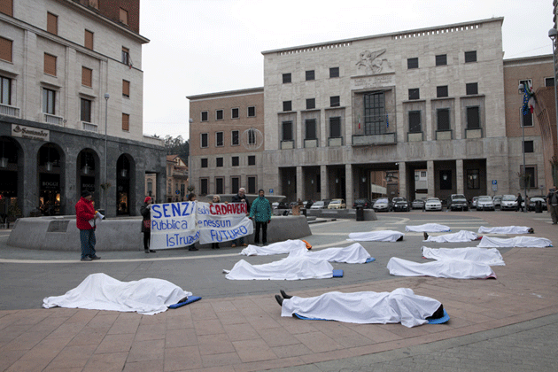 Una situazione che gli insegnanti del coordinamento docenti di Varese e provincia, in lotta da mesi per mettere in luce la grave situazione della scuola, non hanno dimenticato nemmeno il primo giorno dell’anno. Martedì mattina hanno messo in scena, sotto lo sguardo attonito dei passanti, un flash mob in piazza Montegrappa. “Senza pubblica istruzione solo cadaveri e nessun futuro”, hanno scritto su uno striscione appeso davanti a tanti insegnati a terra coperti da un lenzuolo bianco.