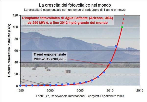 Nonostante la campagna negativa delle industrie petrolifere, evidentemente siamo in tanti al mondo a dare fiducia all’energia fotovoltaica; tanto che nel 2012, con 30 Gigawatt (GW) installati abbiamo raggiunto e superato il traguardo dei 100 Gigawatt di potenza. Certo, è ancora poco rispetto ai circa 5 TW (Terawatt) di potenza elettrica installata nel mondo, ma fa ben sperare. Tutti questi impianti producono già nettamente più di quanto non siano i consumi domestici dell’Italia intera. Ovvero, producono l’equivalente dei consumi di 80 milioni di europei. Così l’energia rinnovabile continua a crescere, anche quella eolica che si sta avvicinando ai 300 GW installati. A questo punto, il traguardo del Terawatt installato non appare più remoto e l’energia rinnovabile non può più essere considerata un elemento marginale della rete elettrica.