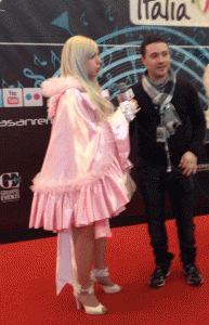 Per non tacere del mago Otelma (pure intervistato ed incalzato con domande ficcanti dalla delegazione di “Mamme Per Sanremo), incontrato in treno, che parla della guerra israelo-palestinese, di servizi segreti e sottomarini. Suonava quasi convincente, avvolto nel suo poncio. O dei punk, che a Londra non si vedono più, però SanRemo è SanRemo e fa risorgere pure loro, ospiti d’eccezione a Radio Azzurra. Posso poi evitare di citare lei? No, dichiara davanti ai microfoni “Ciao, sono Fiocco di Neve, vi ricorderete di me per aver partecipato alla scorsa edizione di X-Factor”. Indimenticabile, quasi. E per concludere (ma la prossima puntata sarà sui giornalisti radio-web-tv) la carrellata, siede su un divanetto in acetato arancione un conduttore affiancato da due stangone. Segni di riconoscimento: l’impronta del rossetto sulla guancia. Il tutto negli studi di “Radio Juke Box”, definita la prima radio telematica italiana. Buon ascolto.