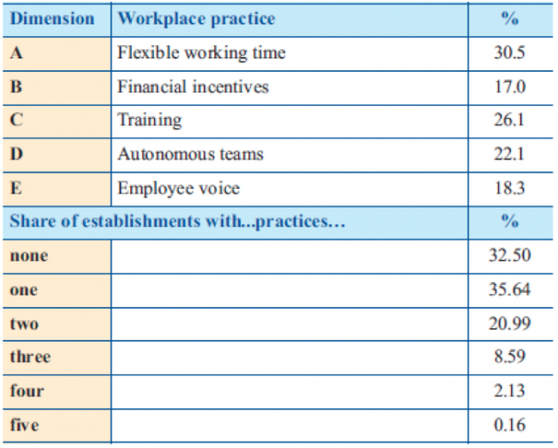 Una risposta la troviamo nel rapporto dell’Eurofound, che ha condotto una indagine per i paesi europei coinvolgendo più di 27mila stabilimenti, industriali e dei servizi. (2) Vi sono analizzati cinque gruppi di pratiche di lavoro: (a) flessibilità degli orari, (b) retribuzioni legate alle performance, (c) formazione, (d) lavoro a squadre di lavoro con autonomia decisionale, (e) coinvolgimento dei lavoratori e delle rappresentanze nel definire l’organizzazione del lavoro.
