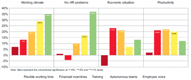 La risposta la fornisce lo stesso studio Eurofound. La figura 1 presenta gli effetti marginali indotti dalla adozione (distinta) dei cinque gruppi di pratiche di lavoro su quattro indicatori di performance: (i) clima lavorativo; (ii) assenza di problemi nella gestione risorse umane; (iii) performance economica; (iv) produttività. Solo la flessibilità oraria induce effetti deboli sulle performance, mentre formazione, coinvolgimento dei lavoratori e delle rappresentanze, gruppi di lavoro hanno effetti fortemente positivi sia su condizioni lavorative e gestione delle risorse umane, che su performance economiche e produttività; mentre gli incentivi economici e finanziari per i lavoratori evidenziano alcune problematiche sulla gestione delle risorse umane, ma non su altri aspetti.
