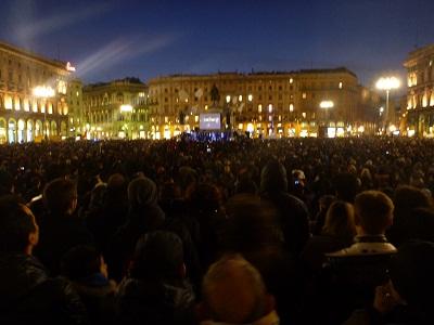 Tutte lì a registrare gli ultimi battiti dello Tsunami Tour. Lascio Piazza Duomo, un uomo è accasciato sul marciapiede. E’ un suonatore ambulante. Non ha più nulla da vendere che il suo sax. Cosa se ne fa della musica se non ha i soldi per pagarsi l’operazione alla gamba. Non ce la fa ad arrivare sotto il palco di Grillo, la barriera umana è invalicabile.
