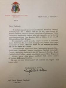 In particolare, nella convocazione inviata ai cardinali elettori dal decano si legge: “In analogia a quanto prescrive la costituzione apostolica ‘universi dominici gregis’ del 22 febbraio ’96 al numero 19, per il caso di morte del sommo Pontefice compio il dovere di comunicare ufficialmente la notizia della vacanza della sede apostolica per la rinuncia presentata da parte del Papa Benedetto XVI, ed effettiva da ieri sera alle ore 20”. Il portavoce del Vaticano, padre Federico Lombardi, ha detto che difficilmente la data del Conclave sarà decisa lunedì.