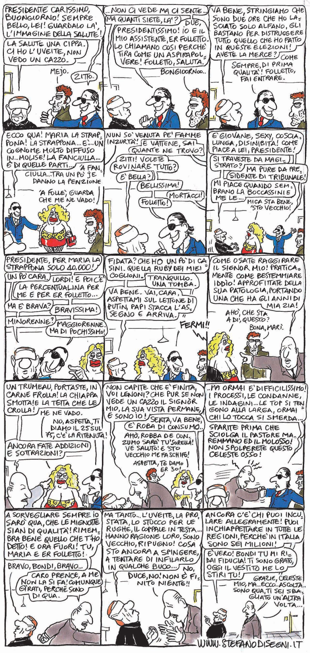 Approfittando della malattia agli occhi del vecchio leader, due personaggi poco raccomandabili cercano di rifilare a Berlusconi merce di cattiva qualità. Quand’ecco che interviene il fido Bondi che impedisce che il raggiro abbia luogo…