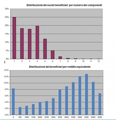 Da quando la misura è stata introdotta nel 2009 e sino a dicembre 2012, i nuclei beneficiari sono stati complessivamente circa 10 mila, con una media di “ingressi” mensile pari a 251 unità. La misura ha mediamente interessato il 3,9 per cento della popolazione. Rispetto agli stranieri, ha riguardato il 17 per cento dei soggetti, contro il 2 per cento della restante popolazione. Oltre il 60 per cento dei nuclei interessati è rappresentato da famiglie con minori, mentre quelle di soli ultra 65enni sono il 12 per cento. I casi interessati dai servizi sociali sono l’8 per cento. A dicembre 2012 risultavano assistiti 3.448 nuclei familiari, per un complesso di 10.591 persone.