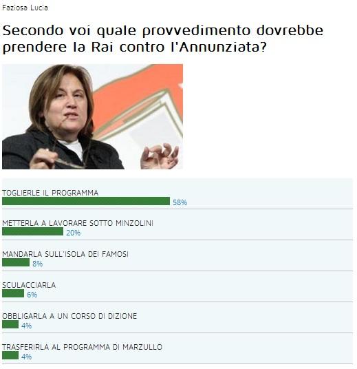 Ma i sondaggi non finiscono qui. Nell’apposita sezione sul sito, ne compaiono altri di stretta attualità. In uno di questi la domanda è: “Chi vorreste mandare in India al posto dei marò?“. In testa alle preferenze dei lettori c’è Mario Monti (32%), seguito da Pierluigi Bersani (18%) e Beppe Grillo ed Elsa Fornero a pari merito (10%). In coda ci sono invece Giorgio Napolitano, Giuliano Amato, Massimo D’Alema e Giulio Terzi, con percentuali comprese tra il 6 e il 9. Poi spunta anche il test che riguarda Lucia Annunziata e il provvedimento che la Rai dovrebbe adottare nei suoi confronti – anticipato dall’occhiello “Faziosa Lucia” – perché nel corso della sua trasmissione In mezz’ora, aveva detto ad Angelino Alfano che i suoi compagni di partito erano “impresentabili”. Il 58% dei lettori vorrebbe che le fosse tolto il programma, il 20% vorrebbe “metterla a lavorare sotto Minzolini“, ma anche “mandarla sull’Isola dei Famosi” (8%) e “sculacciarla” (6%).