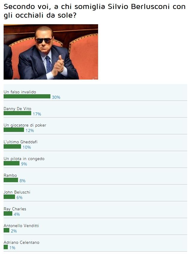 Quanti siano a votare non è dato saperlo, ma le percentuali ci sono. Per quasi un terzo dei lettori del sito di Libero, Silvio Berlusconi con gli occhiali da sole post uveite sembra “un falso invalido“. Il bizzarro sondaggio proposto dal quotidiano diretto da Maurizio Belpietro invita gli utenti a scegliere tra varie opzioni di “somiglianza” del Cavaliere. Quella del disabile col trucco raggiunge il 30% dei consensi ed è seguita da “Danny DeVito” (17%), “un giocatore di poker” (12%), “l’ultimo Gheddafi” (10%), “un pilota in congedo” (9%), “Rambo” (8%), “John Belushi” (6%), “Ray Charles” (4%), “Antonello Venditti” (2%) e “Adriano Celentano” (1%). Opzioni che nei giorni scorsi erano state avallate anche in rete, dove erano comparsi decine di fotomontaggi dell’ex premier mentre interpretava una delle opzioni del “contest” di Libero.