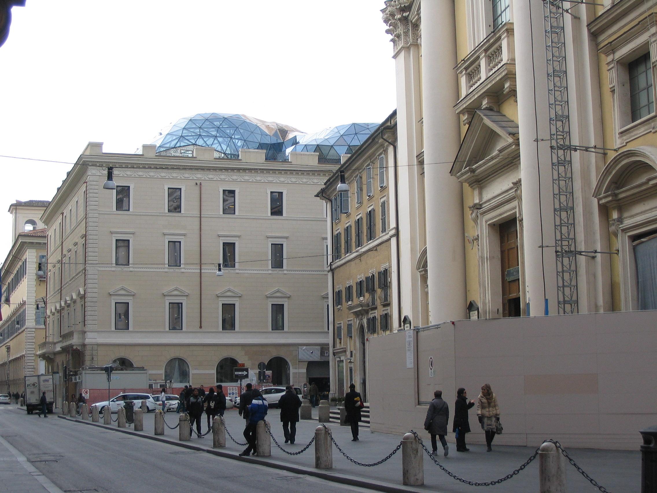 Tra i favorevoli c’è anche Massimiliano Fuksas, famoso architetto. E proprio lui ci porta poco distante da via Giulia a via del Corso, dove si può in questi giorni avere visione di un altro scempio: la sopraelevazione di circa8 metri con una avveniristica vetrata di un palazzo vicino alla chiesa di San Carlo Borromeo.