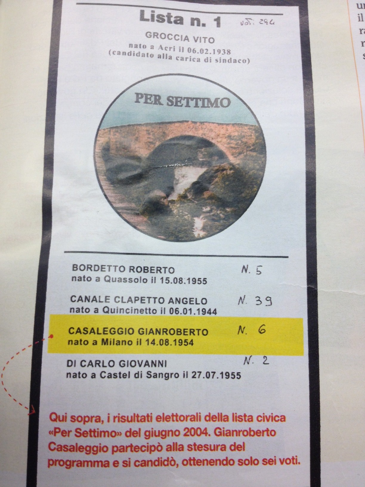 Alle ultime elezioni i 5 Stelle a Settimo Vittone hanno raggiunto il 25,91 percento alla Camera e 24,24 al Senato. Ma nel 2004, quando il suo confondatore Gianroberto Casaleggio si candidò, non andò altrettanto bene. Nel Comune in provincia di Torino infatti, il guru di Beppe Grillo era tra i nomi della lista civica “Per Settimo” capitanata dal berlusconiano Vito Groccia, allora capolista e “politico calabrese di Forza Italia“.