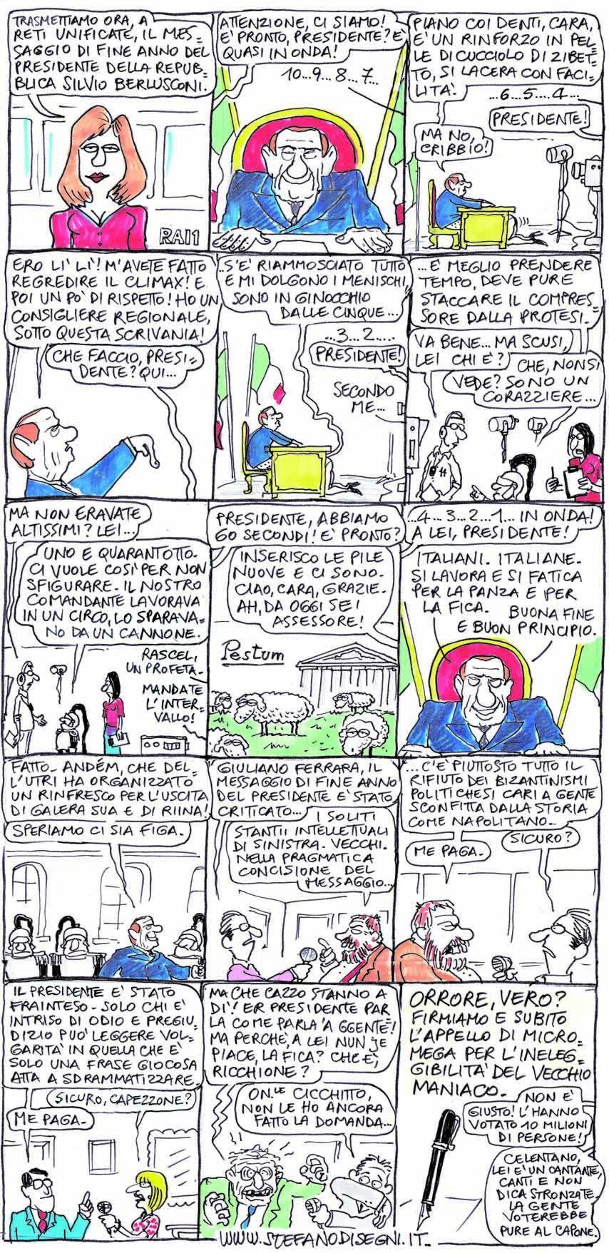 Silvio Berlusconi ha preso il posto di Giorgio Napolitano a capo del Paese. Il suo staff lo circonda prima del consueto messaggio di fine anno. “Italiani e italiani, si lavora e si fatica per la panza e per la figa. Buona fine e buon principio”, dice il Cavaliere davanti ai giornalisti attoniti. Ma Ferrara, Capezzone e Cicchitto sono pronti a difenderlo (come sempre)…