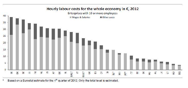 Ebbene, a fronte di un costo medio pari a 28 euro, nel nostro Paese il costo orario del lavoro è stato nel 2012 pari a 27,4 euro. Contro i 34,2 della Francia, i 30,4 della Germania, i 38,1 della Danimarca, i 37,2 del Belgio, i 32,2 dell’Olanda.