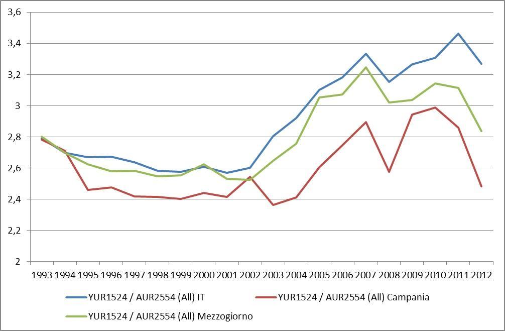 Figura 3. Rapporto fra tasso di disoccupazione dei giovani e degli adulti in Campania, Mezzogiorno e Italia (1993-2012)