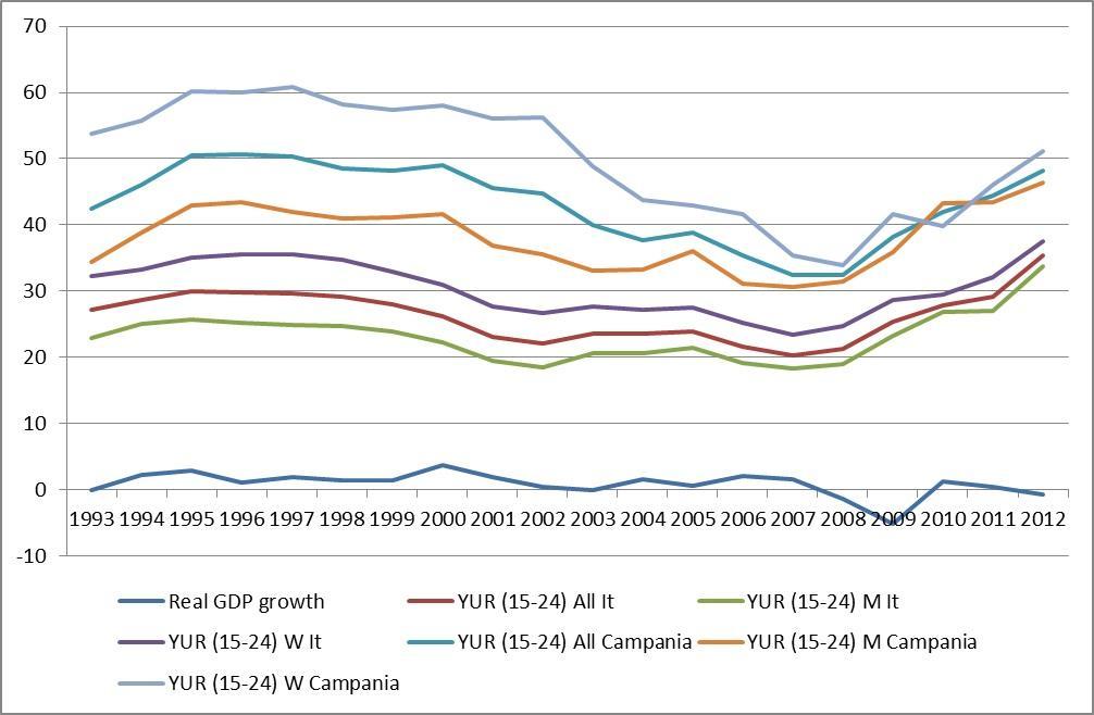 Figura 2. Tasso di disoccupazione giovanile in Campania e in Italia (per genere; 1993-2012)