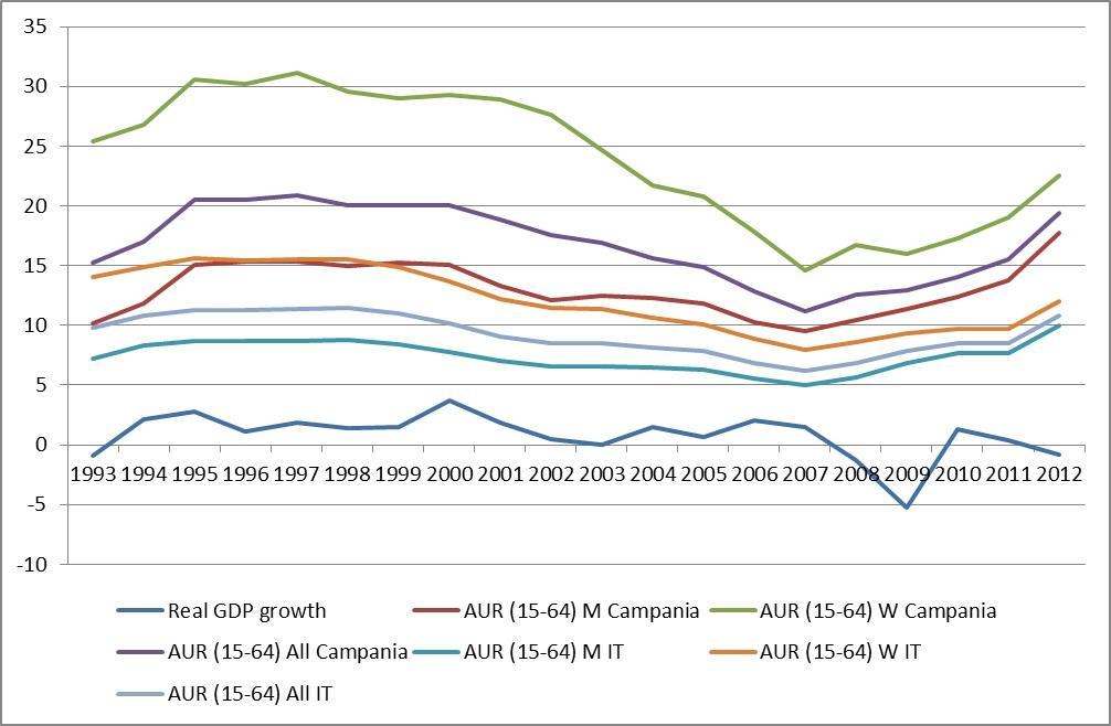Figura 1. Tasso di disoccupazione della Campania e dell’Italia (per genere; 1993-2012)