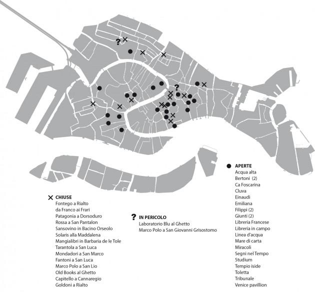 Anna mi ha spiegato che la morte di Venezia è anche e principalmente una morte culturale, che la chiusura delle librerie (quattordici negli ultimi tempi e almeno due a rischio immediato – vedi mappa a fondo pagina) non è altro che l’effetto dell’asfissia di lungo corso a cui da decenni è sottoposta la città, strangolata dal boa constrictor del turismo di massa. E mi ha detto soprattutto che, per contrastare tutto questo, lei e gli altri autori attivi a Venezia – un centinaio di nomi in tutto – hanno deciso di organizzare una forma di resistenza.