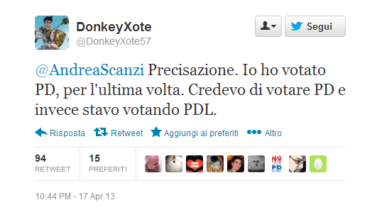 “Precisazione. Io ho votato Pd, per l’ultima volta. Credevo di votare Pd e invece stavo votando Pdl.” E’ in questo tweet di DonkeyXote che si condensano le ragioni della protesta di noi, elettori di centrosinistra, nei confronti dell’inciucio che potrebbe portare Marini a essere eletto Presidente della Repubblica, grazie ad un accordo Pd-Pdl. E, per fortuna, non siamo soli. Anche all’interno stesso del Pd ci sono persone che – come Civati, Renzi e Scalfarotto – chiedono un ripensamento.