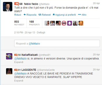 Fabio Fazio scrive: “Tutti a dire che il pd non c’è più. Forse la domanda giusta è: c’è mai stato?” Tra le risposte arriva quella di @SiamolaGente, account satirico che prende in giro i grillini (grazie a @natorev per la segnalazione nda): “A RACCOJE LE BAVE KE PERDEVI IN TRASMISSIONE DIREMO VIVO E VEGETO E RANOANTE. SLAP WPEPPE”.