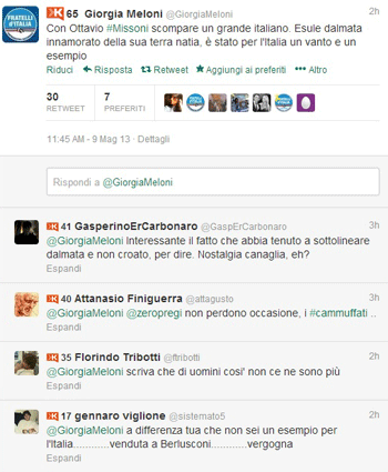Giorgia Meloni invece lancia un tweet sulla scomparsa di Missoni: “Con Ottavio #Missoni scompare un grande italiano. Esule dalmata innamorato della sua terra natia, è stato per l’Italia un vanto e un esempio”. Risposta di @sistemato5: “@GiorgiaMeloni a differenza tua che non sei un esempio per l’Italia… venduta a Berlusconi … vergogna”.