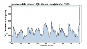 *L’immagine è tratta dal sito The Keeling Curve e rappresenta l’evoluzione della concentrazione della CO2 in atmosfera negli ultimi 800.000 anni presso la stazione di misura situata presso il Mauna Loa (Hawaii, Usa).