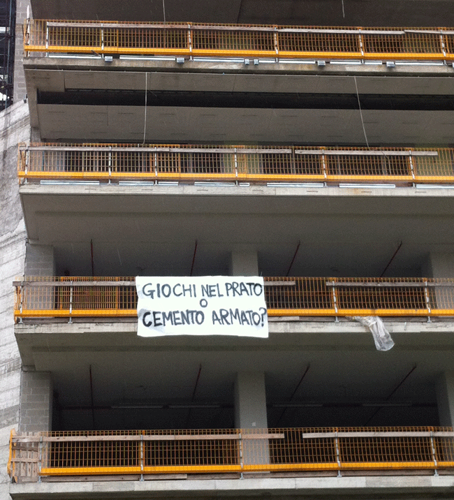 Nella notte i sigilli del cantiere vuoto sono stati violati. “Giochi nel prato o cemento armanto” si legge in uno striscione lasciato sventolare su uno dei balconi. E si critica la posizione del Comune di Milano che è alla finestra rispetto a questa porzione di città, una volta un giardino aperto a tutti. Comune, al momento, impotente perché in attesa della decisione del Tribunale fallimentare che deve liquidare i creditori della Im.co. la società proprietaria dell’area, fallita nel giugno 2012.