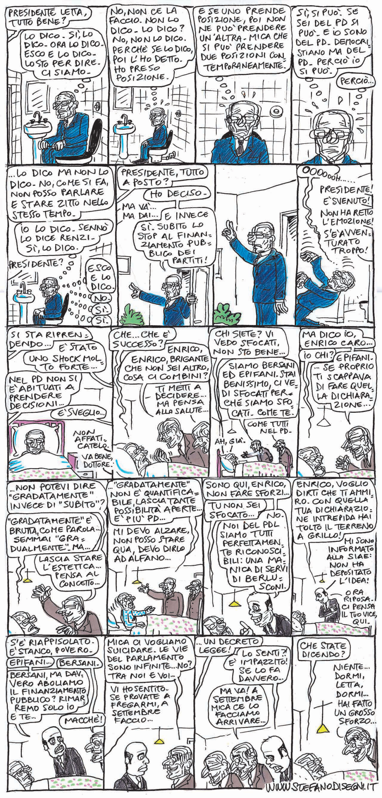 Compiendo un grande sforzo, il presidente del Consiglio Enrico Letta annuncia la fine del finanziamento pubblico ai partiti. Quand’ecco che…